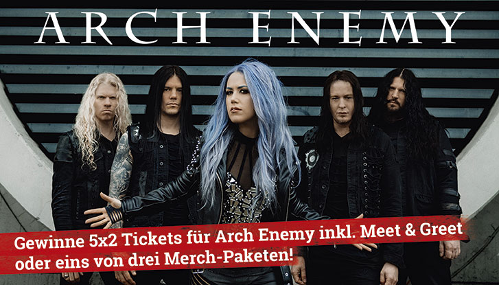 Zusammen mit Arch Enemy verlosen wir 5x2 Tickets für die Show; außerdem treffen die Gewinner und ihre Begleiter die Band beim Meet & Greet. On top gibt es für drei weitere Gewinner je ein Arch Enemy-Merchpaket im Wert von 100,00 €.